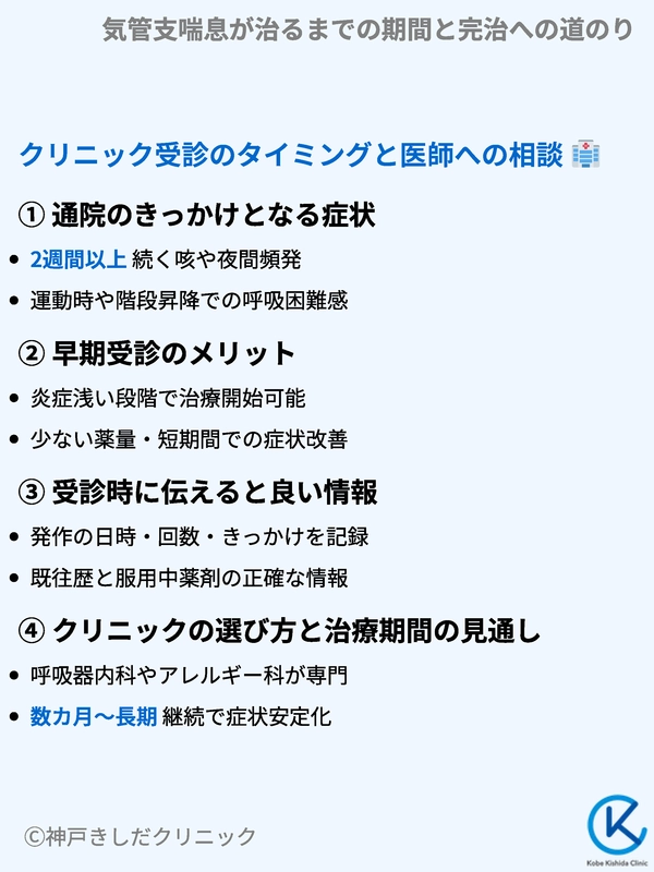 早めにクリニックへ行くと気道の炎症がまだ浅い段階で治療を開始でき、より少ない薬や短い期間で症状を抑えられることが多いです。