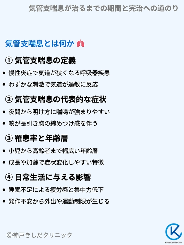 この記事では気管支喘息が治るまでの期間や完治と呼べる状態に近づくための考え方、さらに治療や日常生活の工夫などについて解説します。