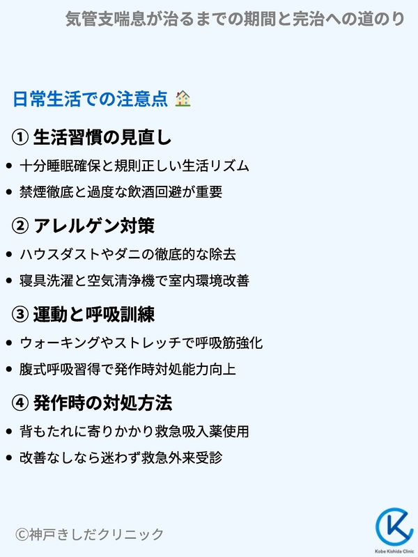 定期的な通院 | 症状や呼吸機能の変化を確認し治療を継続する | 症状悪化の早期発見と薬の調整が可能 |
