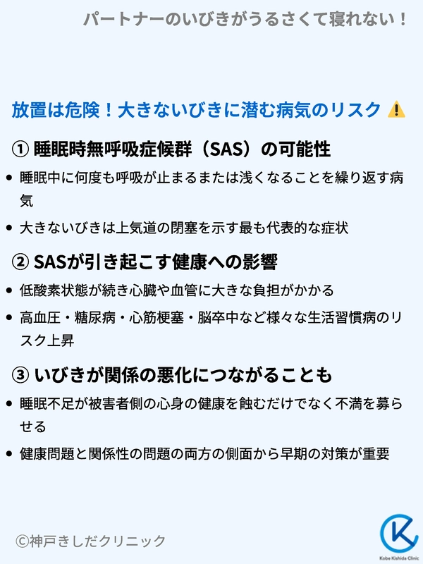 ただうるさいだけでなく、以下のような特徴が見られる場合は睡眠時無呼吸症候群(SAS)の可能性があり、早期の受診が必要です。
