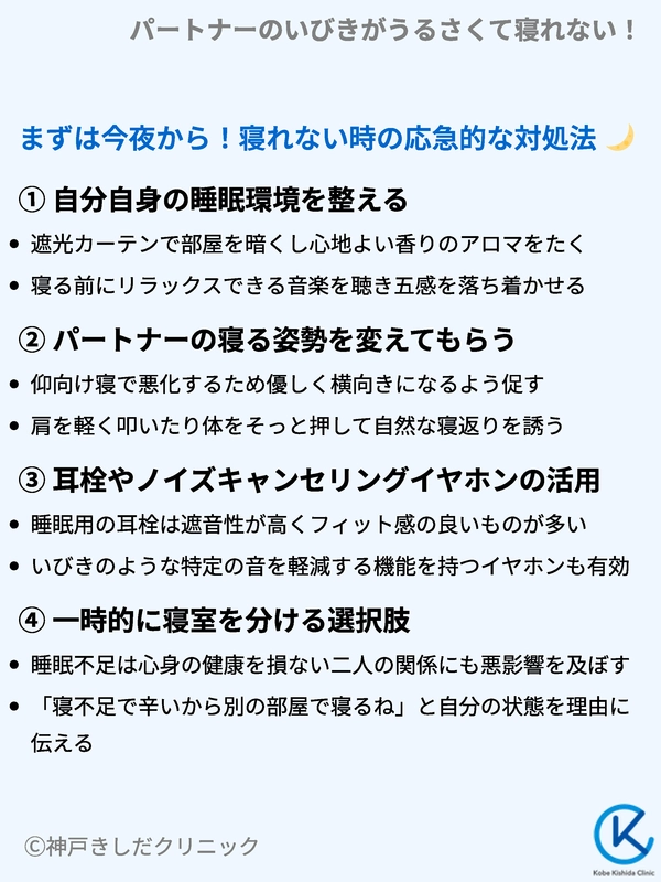 どうしても眠れない日が続くのであれば、一時的に寝室を分けることも検討しましょう。睡眠不足は心身の健康を損ない、日中の活動や二人の関係にも悪影響を及ぼします。