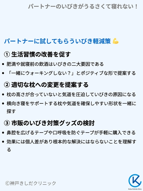 横向き寝をサポートする枕や気道を確保しやすい形状の枕など、パートナーに合った枕を一緒に探してみるのも良いでしょう。