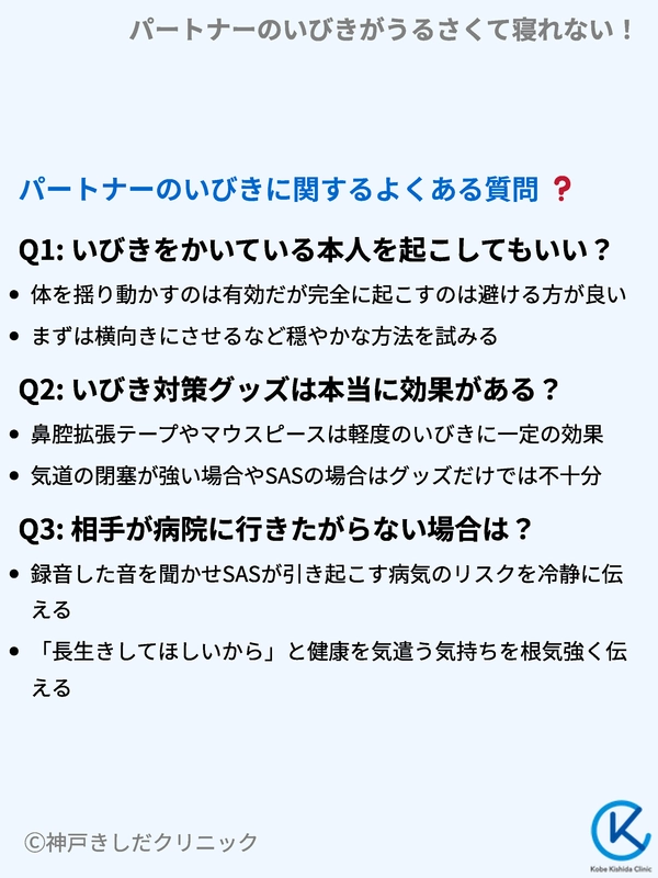 最後に、パートナーのいびきに悩む方からよく寄せられる質問にお答えします。