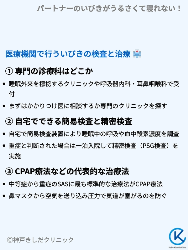 いびきや睡眠時無呼吸症候群の相談は、主に「睡眠外来」を標榜するクリニックや呼吸器内科、耳鼻咽喉科、精神科などで受け付けています。