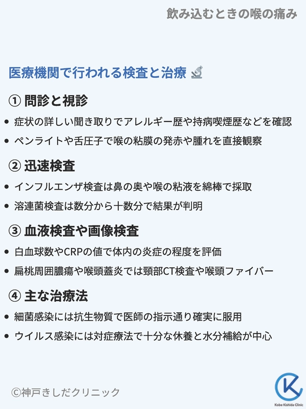 扁桃周囲膿瘍や喉頭蓋炎など、より重篤な状態が疑われる場合には、頸部CT検査や喉頭ファイバースコープ検査(細いカメラで喉の奥を直接観察する検査)などが行われることもあります。