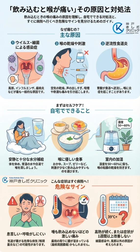 この記事では、飲み込むときの喉の痛みの原因として何が考えられるのか、ご自身でできる対処法、そしてどのような場合に医療機関を受診すべきかについて、詳しく解説します。