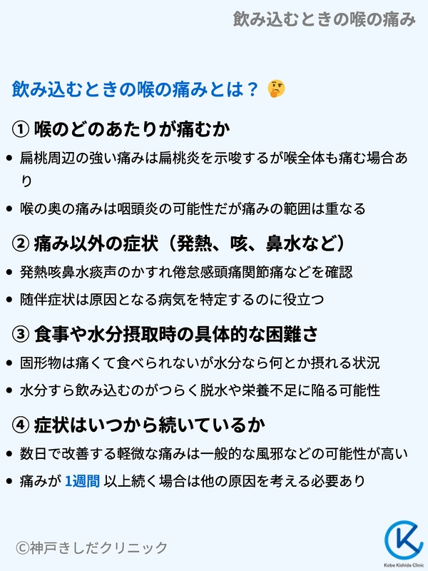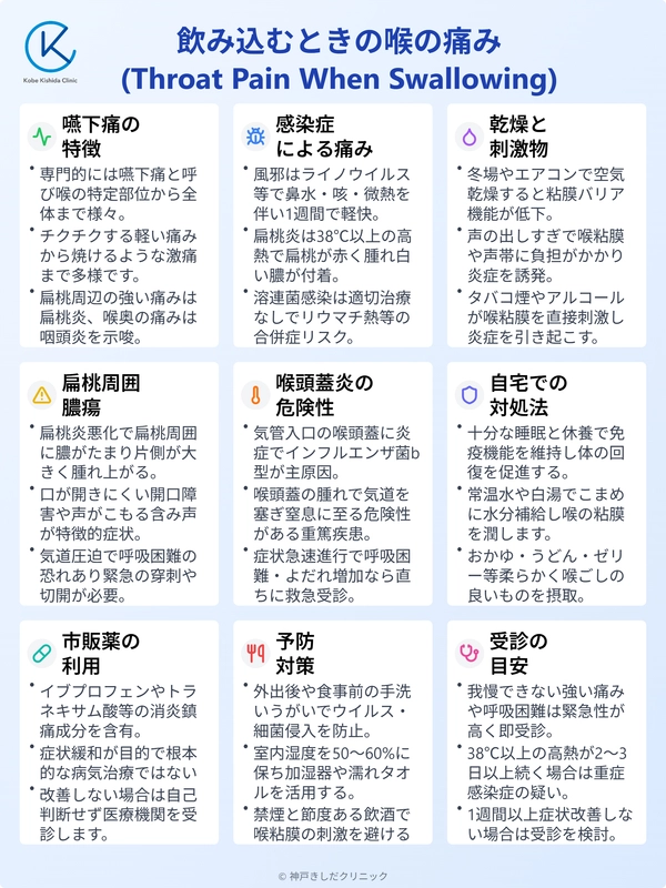 | 喉の痛み | 比較的広範囲、ヒリヒリ感 | 強い痛み、嚥下困難、耳への放散痛 |