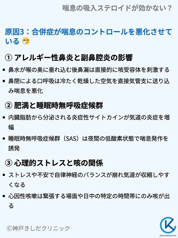 これを「併存症による難治化」と呼びます。気道は鼻から肺まで一つながりであるため、上気道(鼻)の問題は下気道(肺)に波及します。