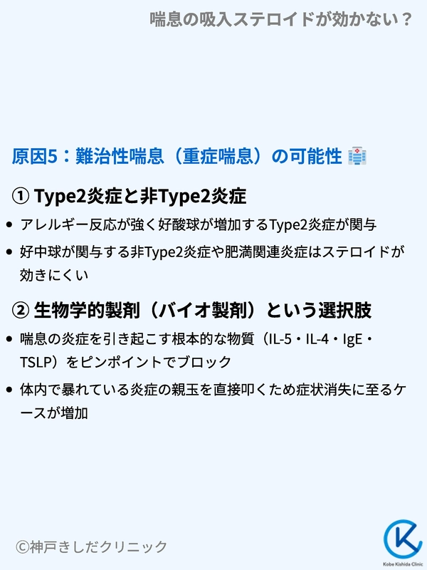 吸入ステロイドが効かないと感じる場合、手技の誤り、診断の相違、合併症の存在、環境因子、あるいは重症喘息である可能性など、主に5つの原因が考えられます。