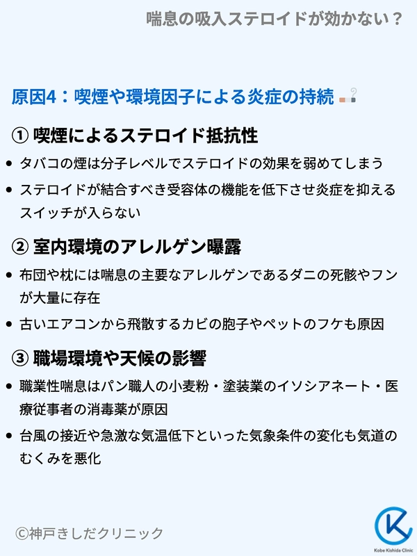 どれほど強力な吸入ステロイドを使用していても、それを打ち消してしまうほどの強い炎症刺激が環境中に存在すれば、治療効果は現れません。