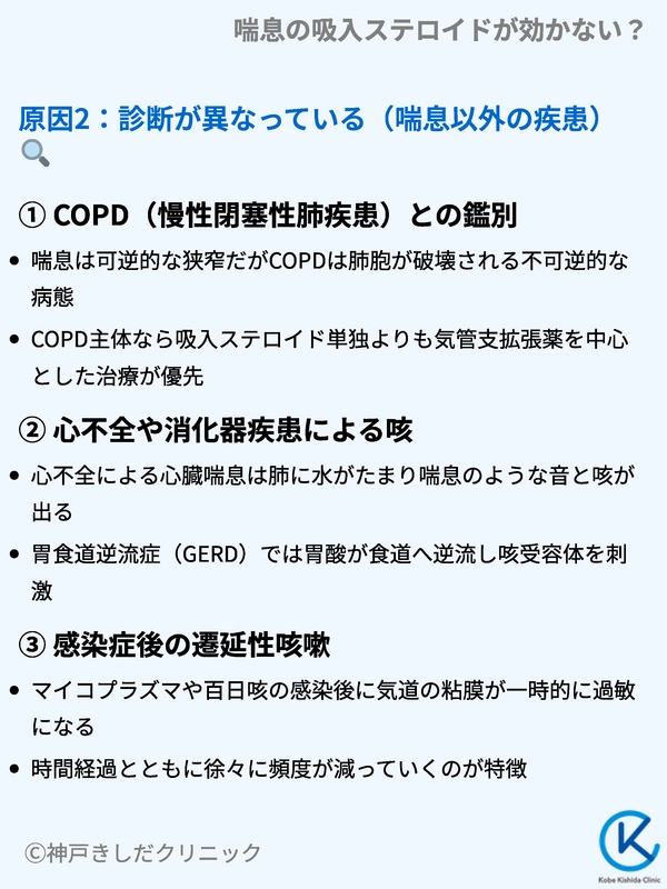 喘息治療ガイドラインに沿った治療を行っても反応が乏しい場合は、一度立ち止まって「本当に喘息単独の症状なのか」を再評価することが大切です。