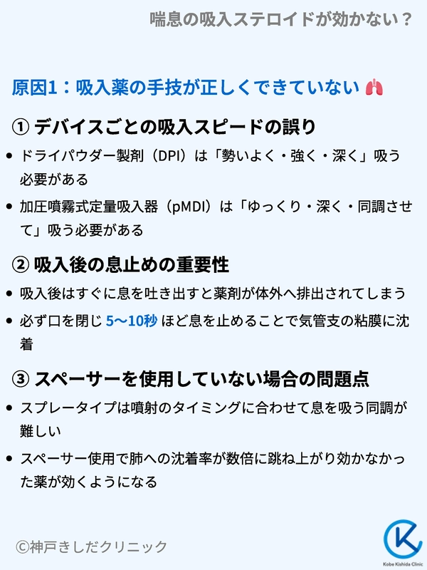 吸入ステロイドが効かない最大の原因は、実は薬剤の選択ミスではなく、吸入操作の不備による薬剤到達度の低下にあります。