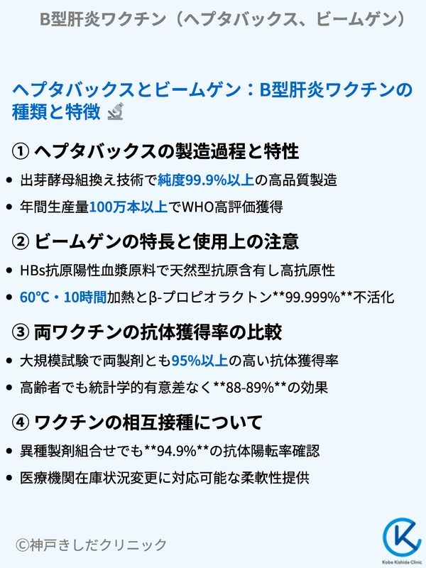 製造方法や特性に違いはありますが、いずれも優れた免疫原性を示し、B型肝炎の予防に重要な役割を果たしています。