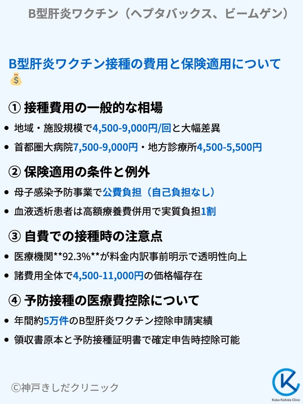 B型肝炎ワクチンの接種費用は医療機関や接種対象者の状況によって異なります。一般的な自費診療での接種費用から健康保険が適用される特定の条件まで、様々な費用体系が存在します。