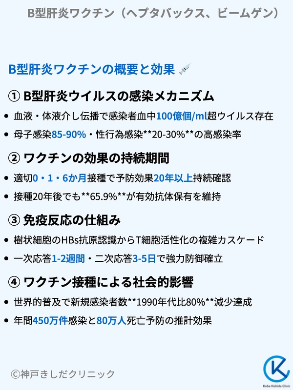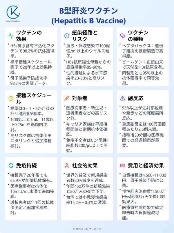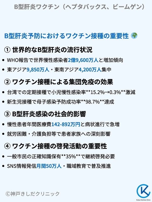 医療経済的観点からも、慢性肝炎の治療費用(年間約500万円/人)と比較して、ワクチン接種(3回で約3万円)は極めて費用対効果が高いことが示されています。