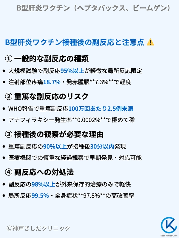 B型肝炎ワクチンは、世界的に確立された安全性プロファイルを持つ予防接種であり、適切な観察と迅速な対応により、重篤な健康被害を予防することが十分に可能です。
