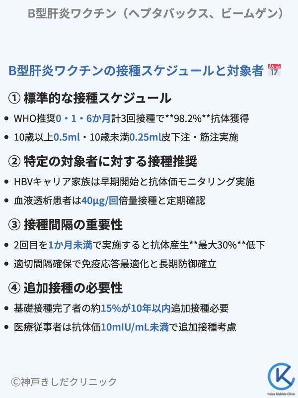 B型肝炎ワクチンの接種は、年齢や感染リスク、免疫状態に応じて適切なスケジュールで実施されます。